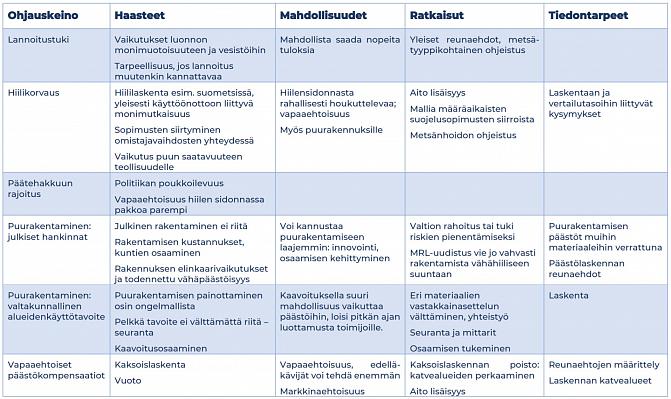 Tarkastelussa on monipuolinen valikoima erilaisia ohjauskeinoja, kuten julkiset tuet ja maksut, kaavoitus- ja hankintapolitiikka, yksityisen ja julkisen sektorin sopimuksiin perustuvat ympäristörahastot sekä yksityisen sektorin hiilikompensaatiomarkkinat.