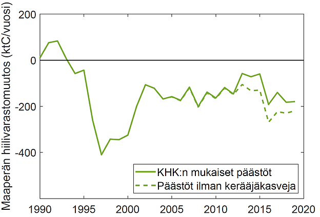 Kasvihuonekaasuinventaarion mukaan kerääjäkasvit vähensivät merkittävästi maaperästä aiheutuvia hiilidioksidipäästöjä (CO2) maankäyttösektorilla (Kuva 2). Kerääjäkasvit vaikuttivat myös maataloussektorin päästöihin: typen mineralisaation dityppioksidipäästöt ja typpihuuhtoumasta aiheutuvat epäsuorat dityppioksidipäästöt vähenivät, kun taas kasvintähteiden hajoamisesta aiheutuvat dityppioksidipäästöt (N2O) kasvoivat. Myös maataloussektorilla kokonaisvaikutus oli päästöjä vähentävä.