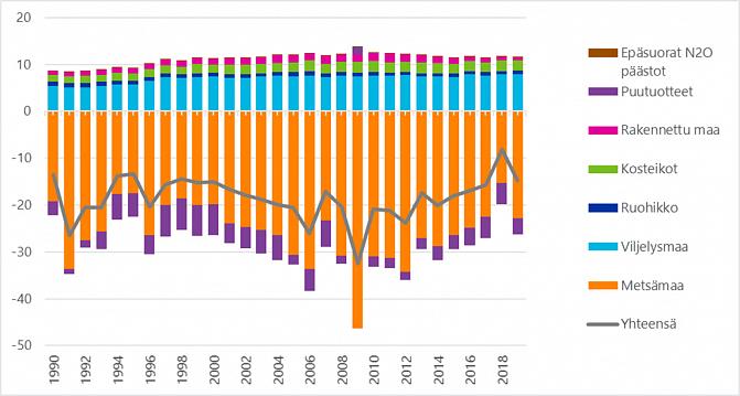 Metsäteollisuuden puunkäyttötilaston mukaan kotimaisen raakapuun käyttö aleni viidellä prosentilla. Tämän vuoksi puutuotteiden nielu oli 26 prosenttia pienempi kuin edellisvuonna (kuva 1). Viljelysmaiden ja ruohikkoalueiden päästöt kasvoivat yhteensä 0,1 milj. CO2-ekvivalenttitonnilla, kun taas sekä kosteikkojen että rakennettujen alueiden päästöt alenivat yhteensä 0,2 milj. CO2-ekvivalenttitonnia.