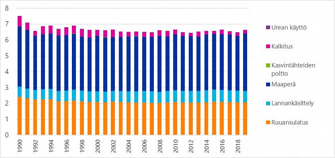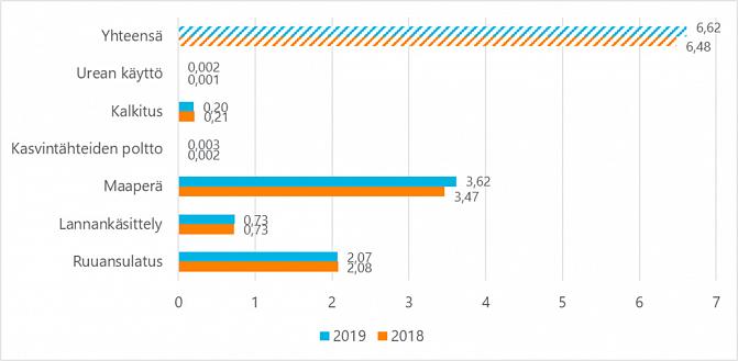 Maataloussektorin kasvihuonekaasupäästöt kasvoivat hieman edelliseen vuoteen verrattuna. Vuonna 2019 päästöt olivat 6,6 milj. CO2-ekvivalenttitonnia, kun vuonna 2018 ne olivat 6,5 milj. CO2-ekvivalenttitonnia. Parempi satotaso ja lisääntynyt keinolannoitteiden käyttö tuottivat suuremmat maaperän dityppioksidipäästöt kasvintähteistä ja lannoituksesta edelliseen vuoteen verrattuna.