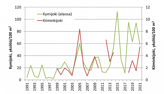 Kymijoella lohien poikastiheydet ovat kasvaneet 1990-luvun alusta alkaneen seurantahistorian aikana ja nykyisin aivan joen alajuoksulla Langiskoskenhaarassa havaitaan Suomen korkeimpia kesänvanhojen poikasten tiheyksiä (58 poikasta aarilla tänä syksynä).