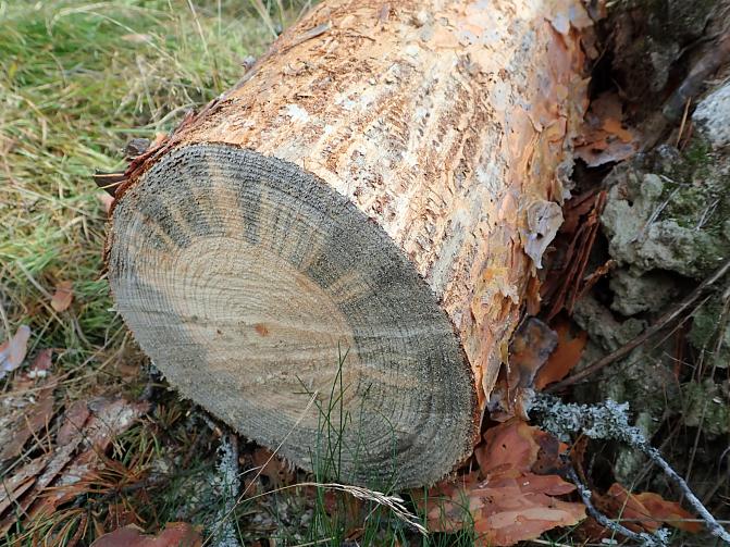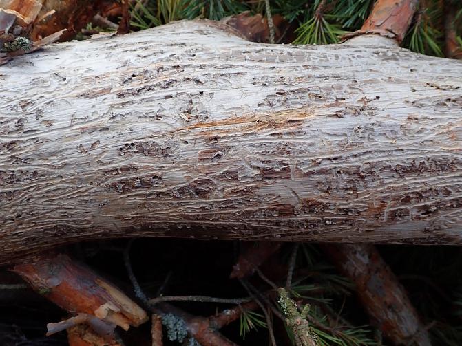 Yläreunan kuva: Kuoren alla aikuisten naaraiden uurtamat emokäytävät ovat purun täyttämiä ja niiden laidalta alkavat harvakseltaan lyhyet toukkakäytävät. Kuva: Tiina Ylioja, Luke.