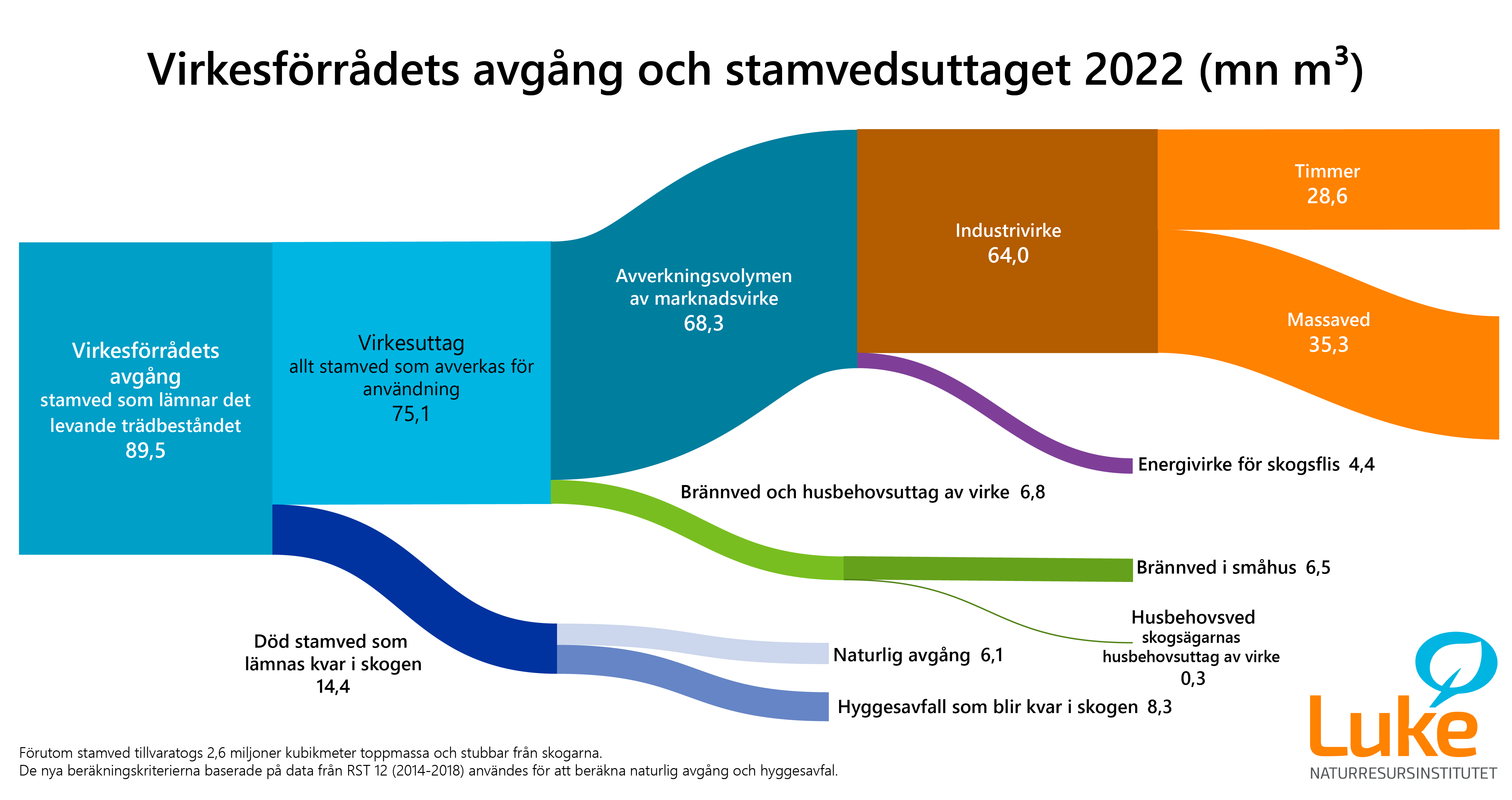 - Virkesavgången minskade jämfört med året innan med två procent till 89,5 miljoner kubikmeter. Den består av stamvirkesuttaget samt åtta miljoner kubikmeter stamvirke som hyggesrester i skogen och sex miljoner kubikmeter naturligt död stamved.